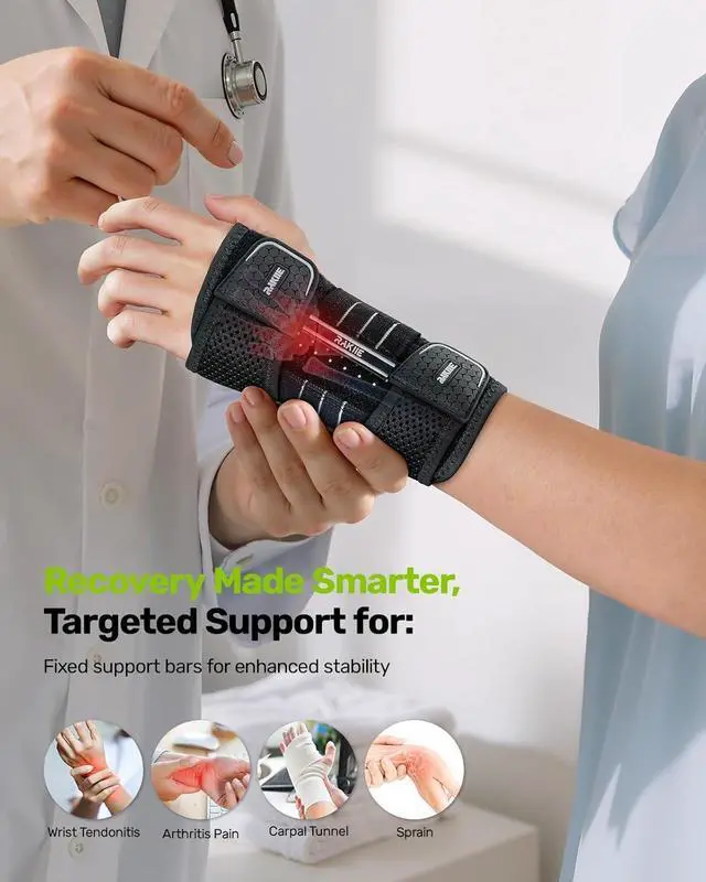 It’s suitable for carpal tunnel syndrome, tendonitis, arthritis, sprains, strains, and post-injury recovery. Its stable design helps reduce wrist pressure and support healing.