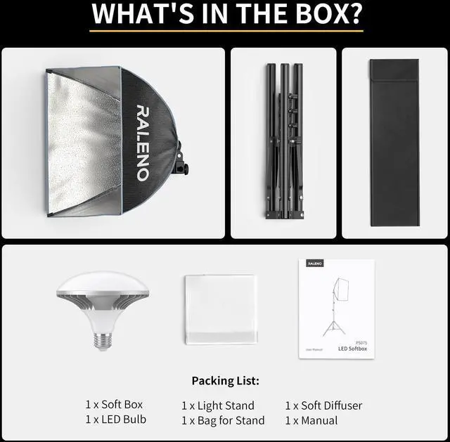 | Material | Aluminum, Aluminum-magnesium alloy LED light base, Frosted High Translucency Softbox Diffuser, Nylon cloth soft box |