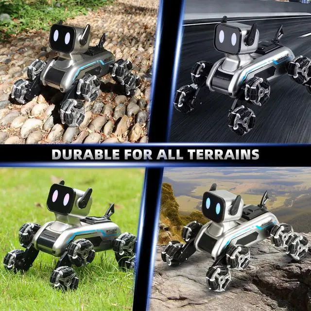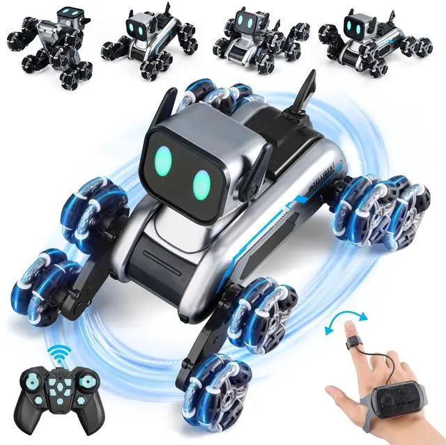 8WD RC Stunt Dog This wrist remote control car features a robot dog design with 8 wheels for incredible stunts and maneuverability. Can perform standing, lying down, climbing, moving in all directions,spinning in 360 degrees and dancing. This rc stunt car lets kids experience the fun and creativity of technology, keeping them engaged and entertained for hours