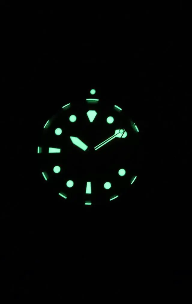 Ready for challenging dives, this freediving watch is water-resistant up to 200 meters. It features a durable stainless steel bezel with a black aluminum insert, and a securely fastened screw-down crown and case back to maintain integrity under pressure. The anti-reflective coating on the dial and the clear luminous hands and markers ensure readability under any conditions, even in dim lighting.
