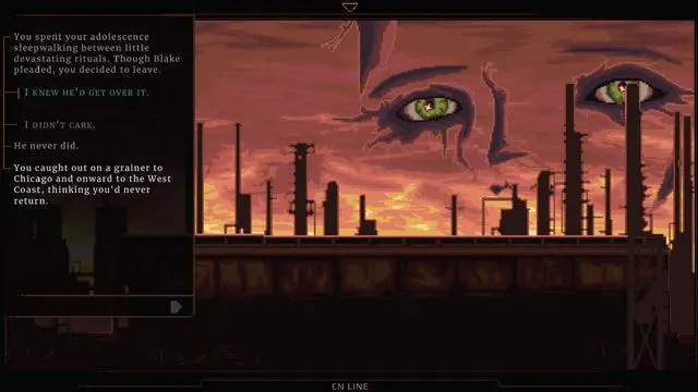 NORCO’s painterly and cinematic pixel art draws the player into its quotidian sci-fi world of disappearing swamplands, labyrinthine oil refineries, and other landscapes inspired by the titular town of Norco, Louisiana and other parts of Greater New Orleans. Sink into the rich field recordings and sound design by fmAura and a driving, post-industrial electronic score from Gewgawly I.
