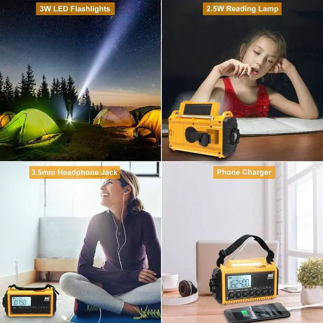 This is a multifunctional handy emergency radio meeting a lot of your survival needs. Features include a 3W flashlight and 2.5W reading lamp that can light your way at night, and you can drop the brightness setting to low to conserve power. A USB port that can be used to charge devices including cell phones, tablets, and other smart devices. Plus a 3.5mm headphone jack, you can enjoy personal music time without bothering others.