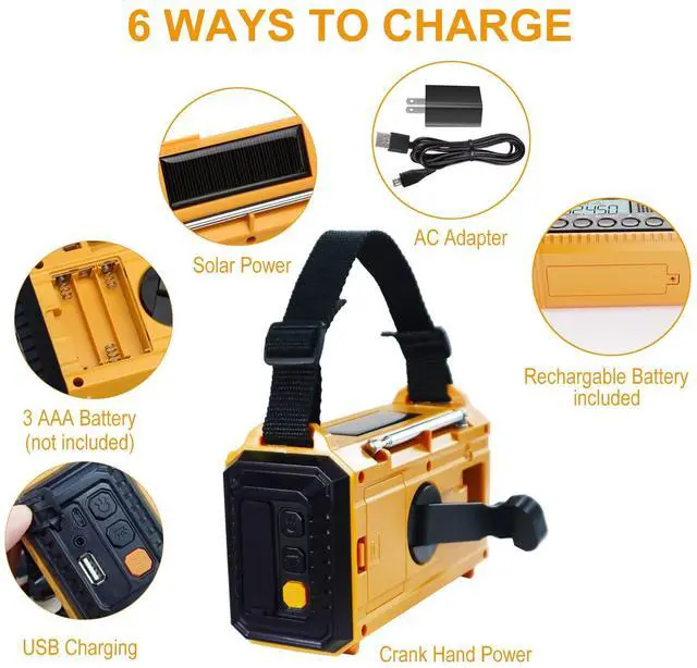 6 ways to power this emergency radios including a built-in rechargeable and replaceable battery, an AC adapter, DC 5V USB input, 3 AAA batteries(not included in packing), solar panel, and hand crank. An AC power connection is vital to preserving battery life. At a lengthy power outage, a weather alert radio with multi-power sources is always ready to use and alerts you during emergencies.