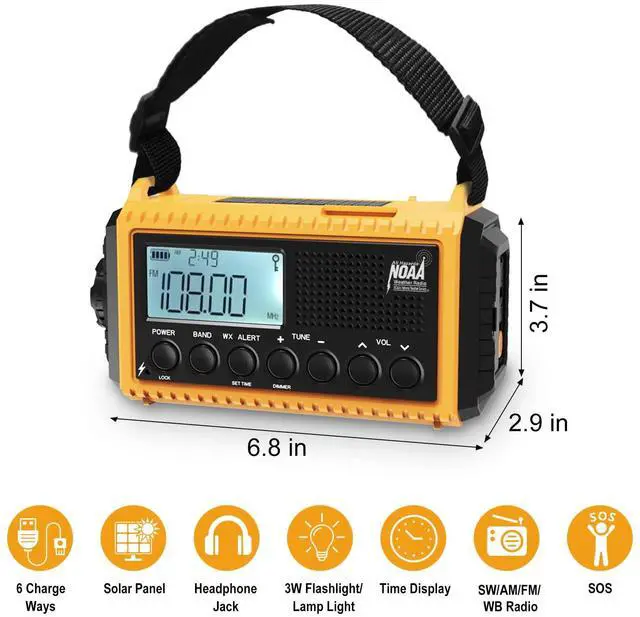 This is an emergency weather radio that everyone should have! You'll be glad to have this for emergencies! This weather radio has a strap to carry, small and portable. It's clear and lightweight if you need to bug out. Very helpful when you have no power, whether camping or hiking or power outage. IPX3 waterproof and SOS alarm is also a plus!