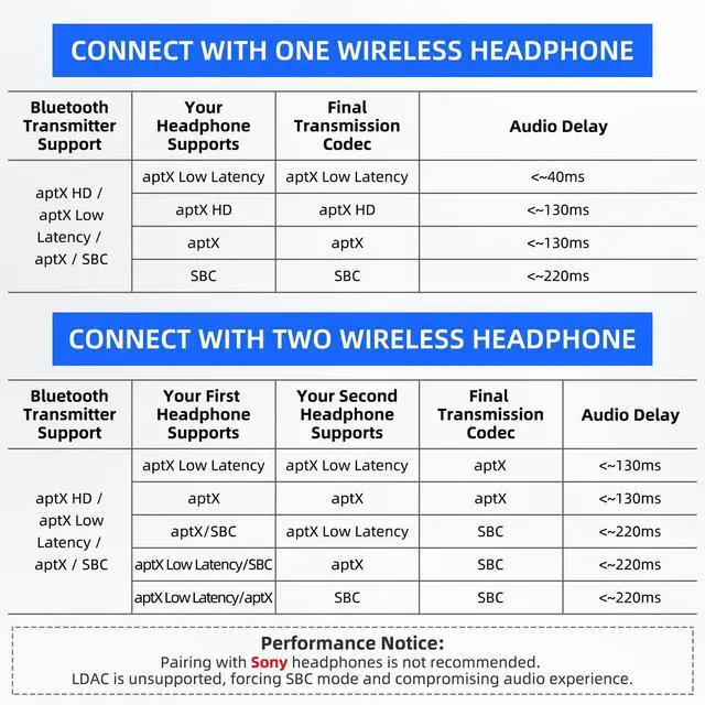 Support Audio Aptx low latency: This Bluetooth transmitter supports SBC/Aptx/Aptx HD/Aptx low latency/Aptx adaptive, and will adapt according to your headset configuration. Note: Your source device and headset must support these codecs to work properly.