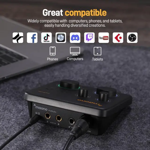 The PS22 Lite audio interface is a game-changer for a diverse range of creative individuals. Whether you're a podcaster looking to deliver crystal-clear audio to your listeners, a home studio enthusiast striving for professional sound quality, a live streamer aiming to engage your audience with immersive audio, or an audio engineer seeking reliable performance, the PS22 Lite has you covered. Designed for recording enthusiasts and streamers, it comes equipped with two professional, independent, vehicle-grade chips that ensure stable performance and exceptional sound quality. Record at an astonishing 24-bit/192kHz high resolution, capturing every nuance and detail of your sound with a dynamic range of up to 106dB. The result is a sound that is clear and realistic, bringing your recordings to life. The PS22 Lite XLR audio interface offers up to 56 dB of preamp, capable of driving most dynamic microphones with low gain. This provides a warm and clear sound, whether you're using a condenser or dynamic microphone. With built-in 48V phantom power, you can be confident in achieving extremely clear sound every time.