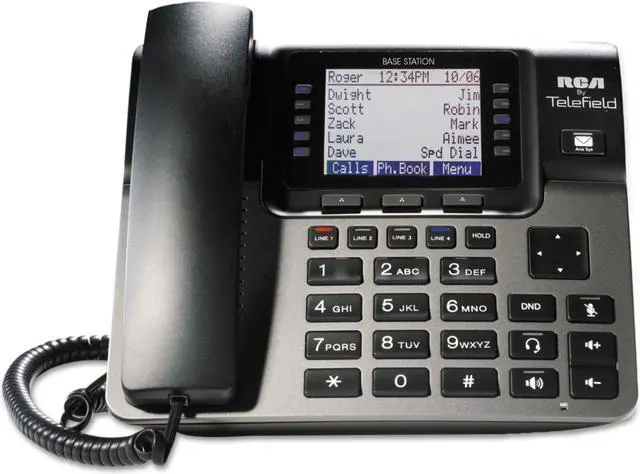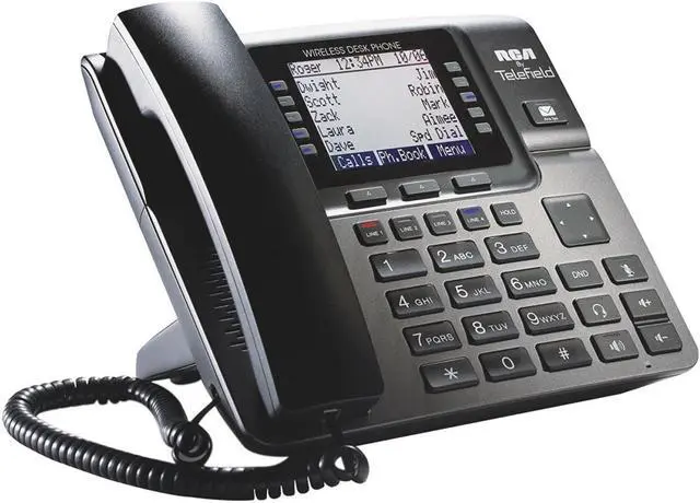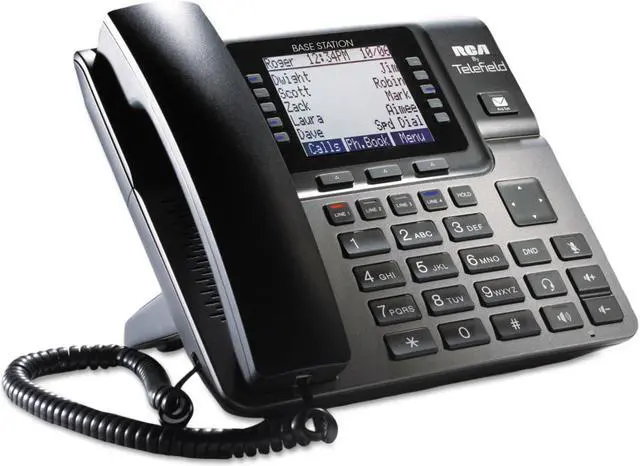 RCA Unison Wireless Deskset Expansion Telephone - 4-line accessory deskset. Compatible with RCA Unison base station, must have base station for phone to work. Features DECT 6.0 wireless technology for clear, secure calls. Full duplex speakerphone, large and easy to read display, 9-station status indicators, 200-name & number directory, 20-number speed dial, Do Not Disturb function, caller ID, one-touch voicemail access key, incoming/outgoing call logs, custom ring tones. 2-year warranty. - Type: Corded, Number of Lines: 4-Line, Color: Black, Number of Handsets: 1 Handset, Dimensions: 9" W x 7" H x 5" D, Weight: 2 lb, Pkg Qty: 1, Package Type: Box