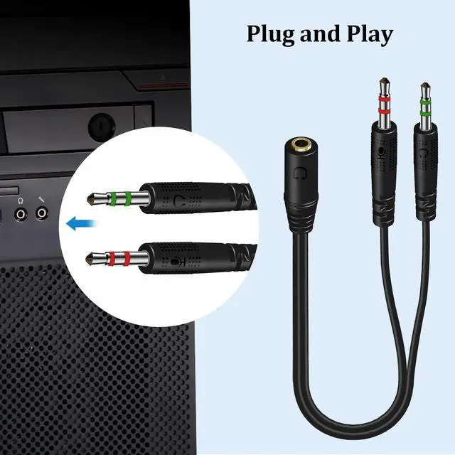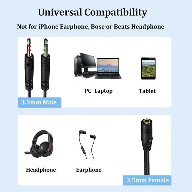The 3.5mm splitter mic audio split from one 3.5mm plug to two - one for the mic jack, one for the audio jack. Easy to connect the headsets of a 4-pole 3.5mm TRRS plug to PC or Laptop with separate audio and mic jacks. Perfect for all PC Applications - Skype, MSN Messenger, Yahoo, Google Voice, etc. Note: NOT compatible with OMTP standard, Apple earphones, Bose or Beats headphones