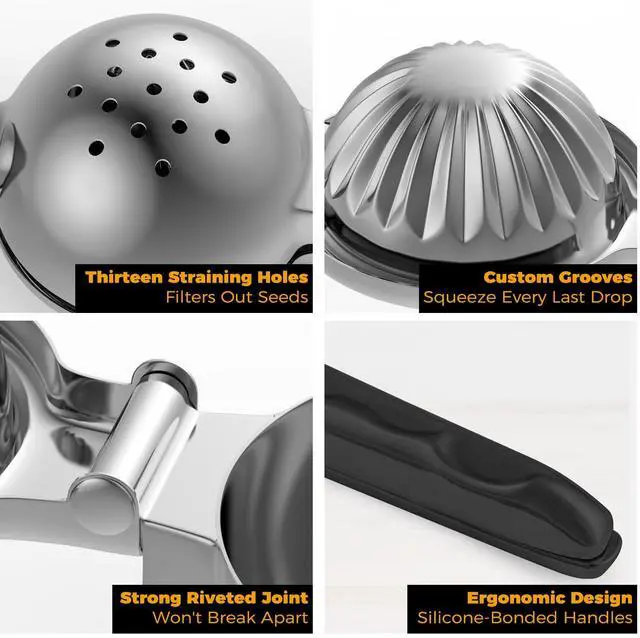 Place your fruit cut side down in the Stainless Steel Squeezer and then simply press the handles together: The Squeezer strains the seeds and pulp as it juices.