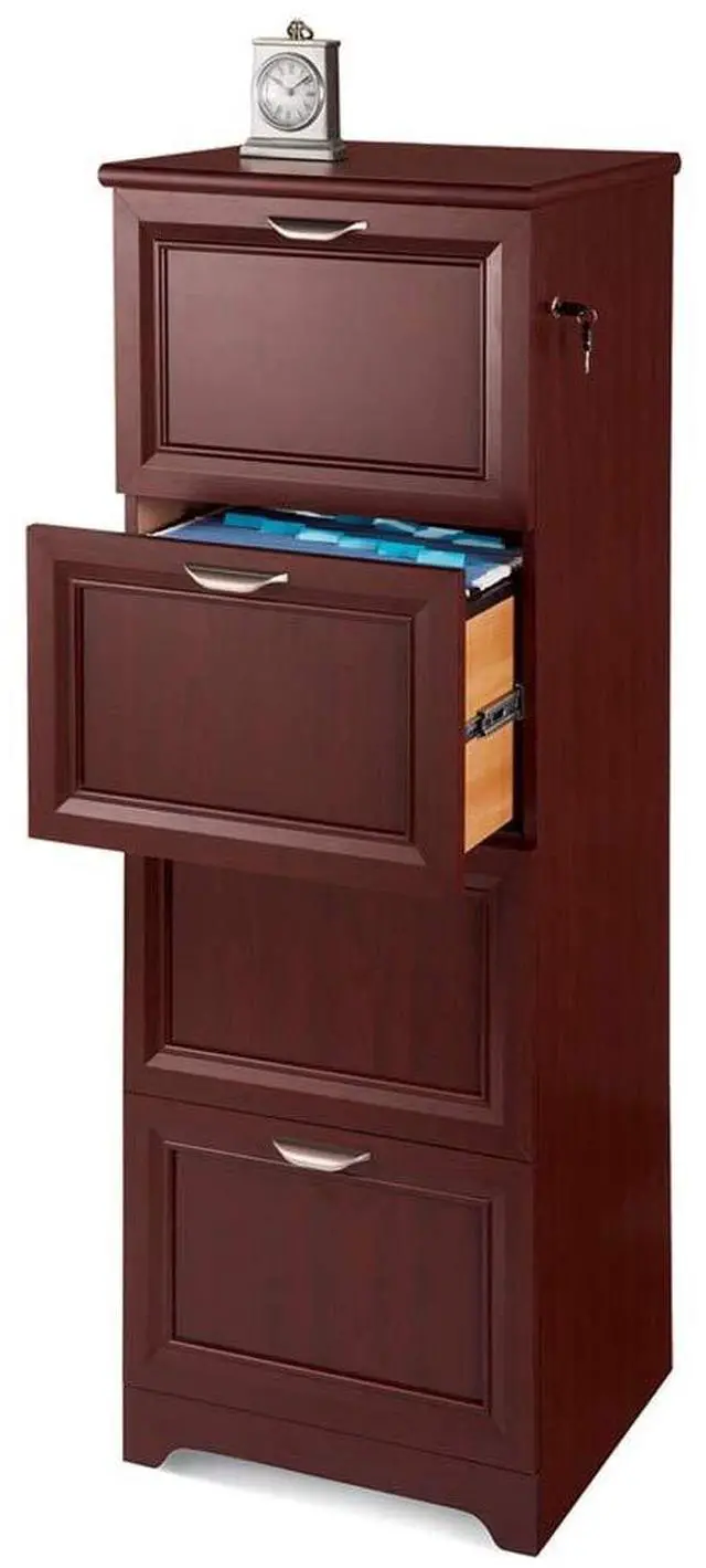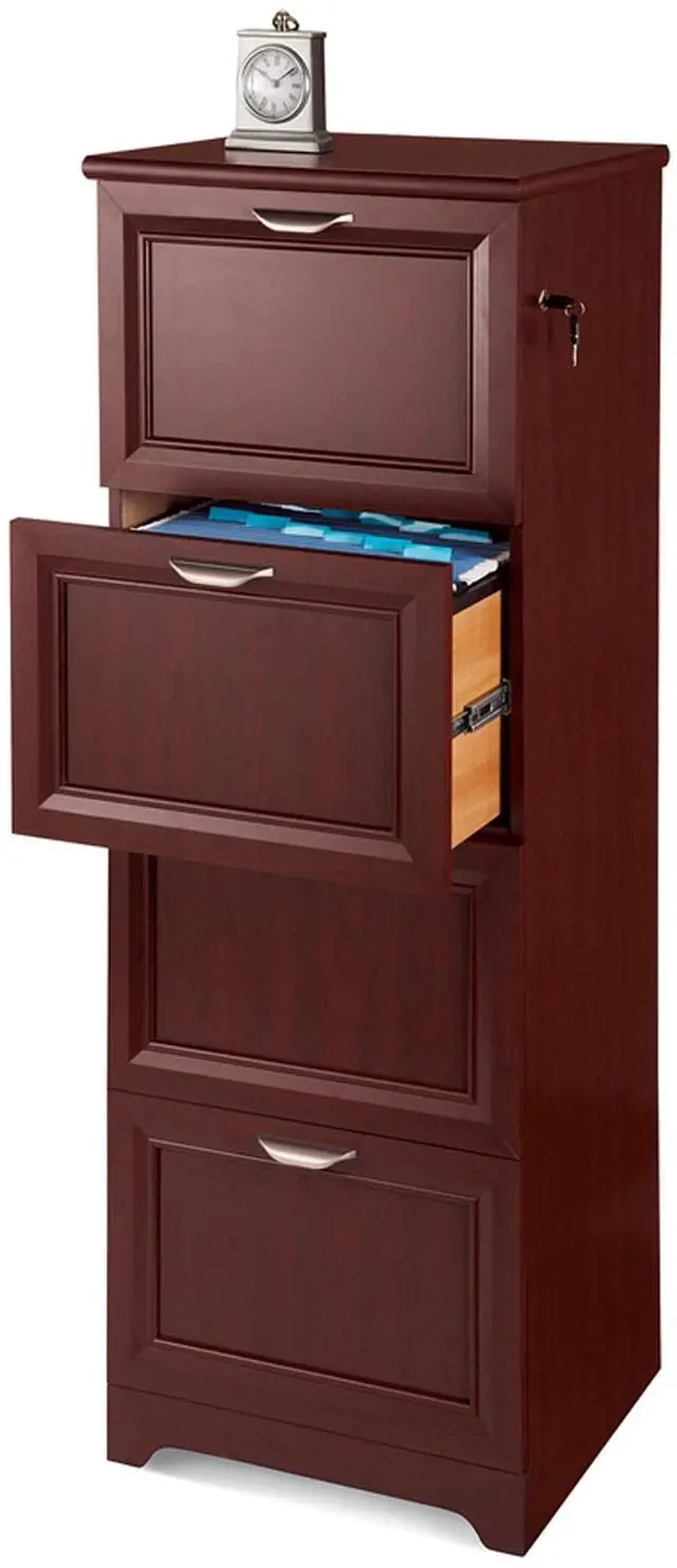 Complement your home office decor with this Realspace Magellan collection vertical file cabinet. Crafted engineered wood materials delivers an attractive solid piece, while the 4 drawers accommodate both letter-size and legal-size files for versatile use. This Realspace Magellan 4-drawer file cabinet boasts a sturdy build for lasting strength and stability. Full extension legal/letter file drawers. Crafted with engineered wood materials. Ball bearing drawer slides for smooth operation, increased weight capacity and durability. Brushed silver handles. Hang rails included. Assembly required. Finished in classic cherry. Tested to meet ANSI/BIFMA Performance Standards - Manufacturer testing has been conducted on this product to meet specific performance requirements and safety standards set forth by the American National Standards Institute (ANSI) and the Business and Institutional Furniture Manufacturers.