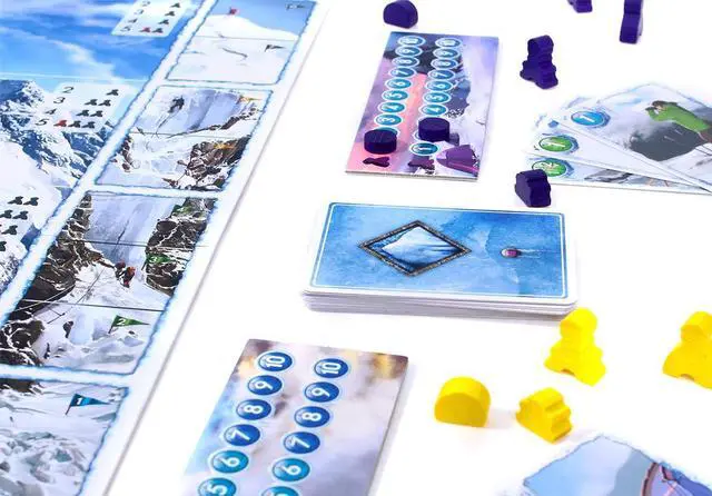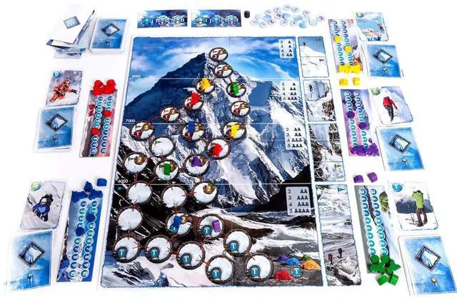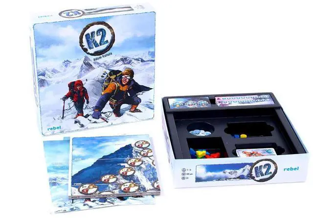 K2 is the second-highest mountain on Earth as well as the second deadliest. It's known as the Savage Mountain, as it kills one person for every four who have reached the summit.. Now your team stands in its shadow, ready to climb for fame and glory. You know the dangers of K2 all too well. Extreme weather with frequent and deadly storms, exposed, steep, tricky routes and lack of oxygen await you on your way to the summit. You will test your climbing skills to death, try to outsmart the ever-changing weather and always worry about the acclimatization of your 2 mountaineers. Also there are the other teams ready to take the glory for themselves. K2 is a board game in which each player controls a team of 2 mountaineers, trying to climb to the summit of K2 and return before the other players' teams and before the mountain kills them. Every player uses an identical deck of cards. You use the cards to move your climbers on the route pictured on the gaming board, or to acclimatize the members of your team. You can also set up a tent and wait for better weather. You will have to choose your path carefully, as the other mountaineers can block your way, and watch the upcoming weather which can lower your acclimatization to 0, thus killing your climbers. K2 is a hand management game for 1-5 players, with strong interaction and low luck factor, lasting up to 60 minutes. The theme is very well represented by the mechanics, including such elements as changing weather, lack of oxygen and death of the mountaineers. The result is an exciting match for gamers and non-gamers alike. The box includes, among other materials, a double-sided board with two different routes to the summit (easier and harder) and two sets of weather tiles (for summer and winter).