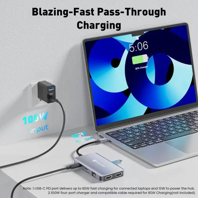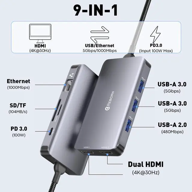 ALL-IN-ONE 9-IN-1 USB C DOCKING STATION: This USB C hub multiport adapter integrates dual HDMI 4K ports, a Gigabit Ethernet port, 2x USB 3.0 ports (5Gbps), 1x USB 2.0 port, a dedicated 5Gbps USB C data port, a 100W PD charging port, and an SD/TF card reader. It is the ultimate laptop docking station to expand your connectivity.
