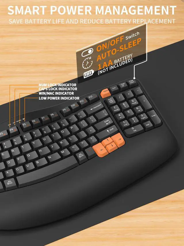 Ergonomic Wireless Keyboard with Wrist Rest, Wave Keys for Comfortable Natural Typing, 2.4GH z Ergo Wireless Computer Keyboard for Windows, Mac OS Laptop/PC/Notebook (Black&Orange)