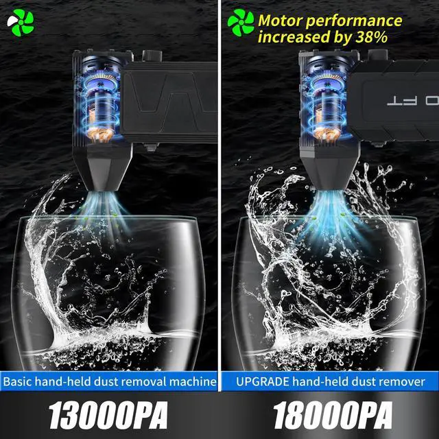 Powerful 18000PA Suction with Brushless Motor This cordless handheld vacuum features a high-performance brushless motor that delivers up to 18000PA of strong, consistent suction. Effortlessly removes pet hair, crumbs, dust, and debris from car seats, keyboards, sofas, and other hard-to-clean areas.