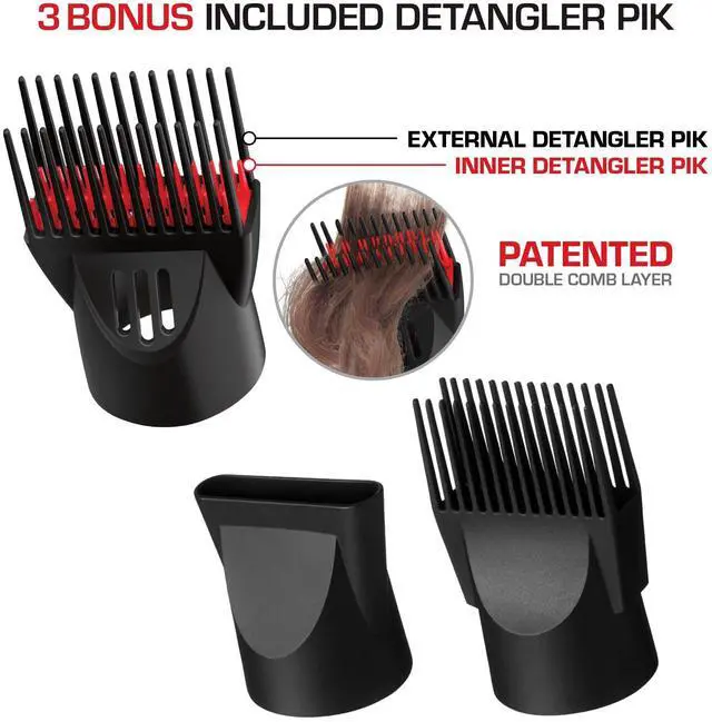 Includes 1 double layered detangler pik, 1 single layered detangler pik, 1 air concentrator