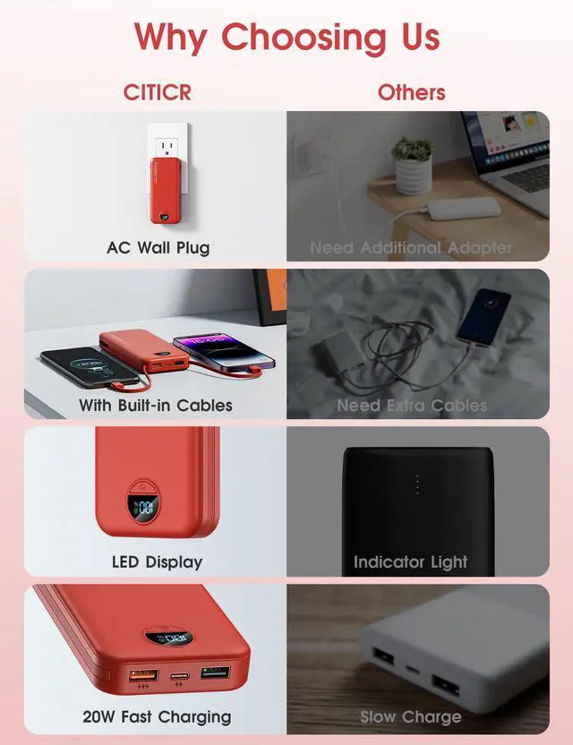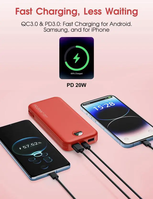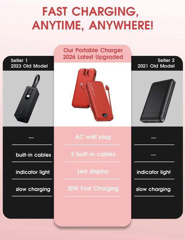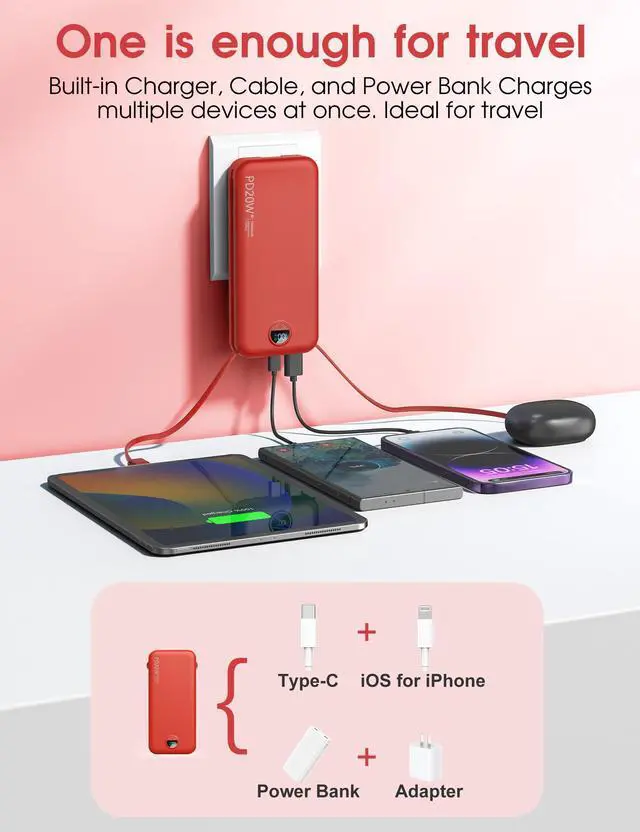 Portable Charger Power Bank, 10000mAh PD20W USB C Fast Charging with Built-in Cables & Wall Plug, 5-in-1 Battery Pack with LED Display, Ultimate Travel Essential for iPhone, iPad, Samsung Red