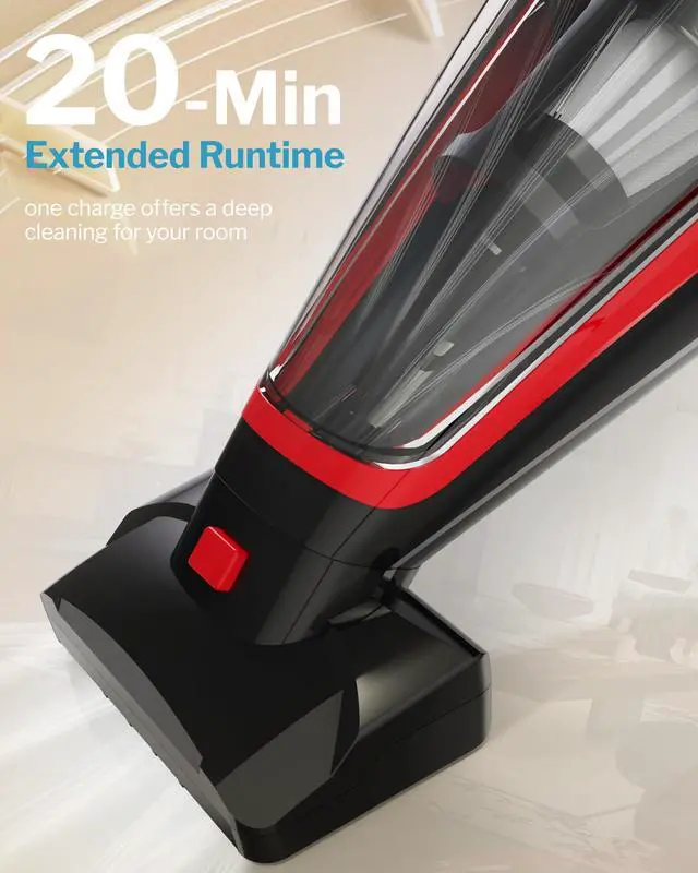 Extended Battery Life: This hand held vacuum includes a battery level indicator for easy monitoring of remaining power. Powered by a sizable 2000mAh battery, it requires about 2.5 to 3 hours to fully recharge. Once charged, it delivers up to 18 minutes of operation with the electric brush attached, and up to 20 minutes without.