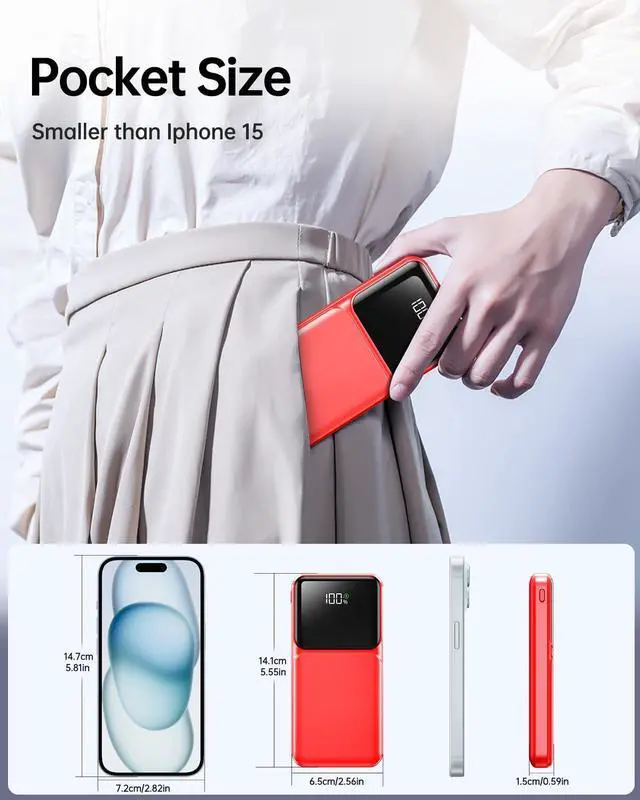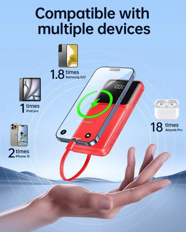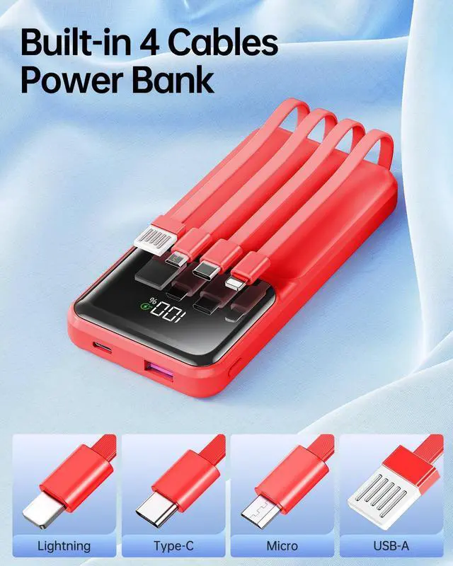 Travel Essentials Portable Charger with Built in Cables: Slim USB C 20000mAh power bank has 4 built in cables (iOS, Type C, USB, Micro) and 3 Charging port , Widely compatible with almost all types smart devices such as for iPhone 16/15/15 Plus/15 Pro/15 Pro Max, Samsung S23,S22,S21,S20, Google, Pixel, Android, iPad, Tablet and more. We use high quality materials to ensure the durability, tear resistance, and bend resistance of this power bank with built in cables. (Airline-approved) USB C and iOS Fast Charging Power Bank: The 20000mAh Multiple port Power Bank with built in USB C(22.5W) and iOS(20W) Output cables have QC4.0 & QC4.0 fast charge technologies can charge mobile phone at a maximum 3 times faster than conventional chargers. Ideal for those who need quick and reliable charging on the travel. Ensures you have enough power to enjoy your trip 5 Outputs & 3 Inputs Power Bank: This Portable charger power bank is designed with 5 outputs and recharge battery pack easily with 3 options. It supports 5 devices charging max simultaneously, no more cluttered charging adapters or cables on your desk now. A great portable charger for multi electronics users who has iPhone, android or micro devices! Upgrade USB C interface serves as both input and output, perfectly fit your new iPhones, iPad and all upcoming USB C devices Slim Pocket Size Portable Charger: This Slim 20000 power bank , and weigh only 0.53lb, portability just like a lighter cell phone, easily slipped into any travel lover's pockets or bag. With digital led display feature, no more hassle of guessing the remaining battery and you can recharge battery pack in time conveniently. A great portable charger for all people Safety System and LED Digital Display Portable Charger: This cell phone battery pack with built in cables is adopted intelligent power management IC and the highest grade materials, which can protect your device from overcharge protection, overvoltage protection, overcurrent protection, short-circuit protection, and overtemperature protection, take care of your electronic devices.Minimalist and elegant LED digital large screen display the battery power even accurately to 1%