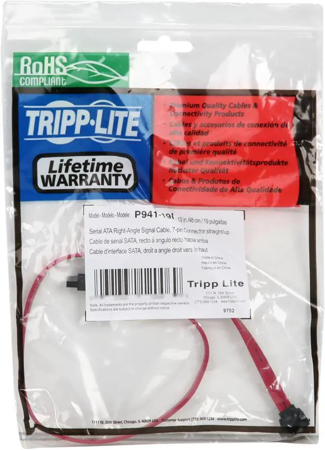 Tripp Lite expands its line of hard drive cables with the introduction of our new line of serial ATA cables. The signal cables connect any high speed Serial ATA device to a Serial ATA controller. Serial ATA delivers two significant benefits: it support much higher data transfer rates (up to 6.0 Gbps...backward compatible to 1.5Gbps) and the narrow cable design helps improve internal air flow. Perfect for the desktop or server that has multiple drives. These cables feature 7-pin straight/7-pin right-angle key up connectors and offer easy installation.
