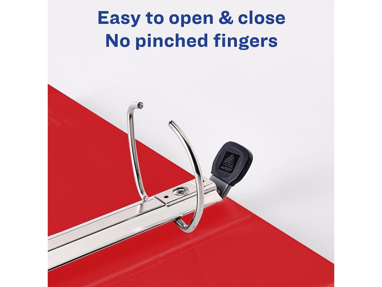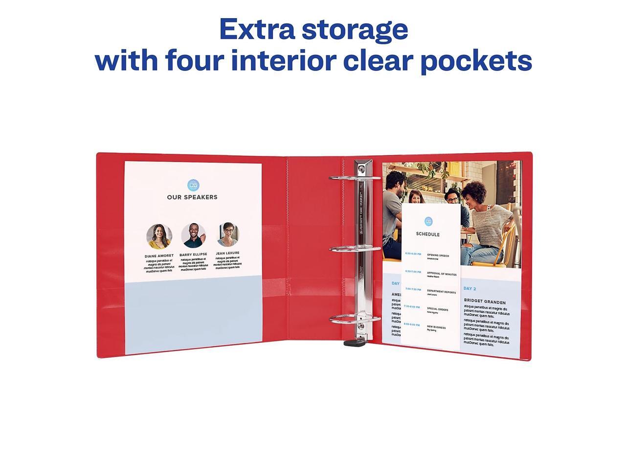 - Avery Red 3 Ring Binders are perfect for organization as school binders, recipe binders, receipt binders and more. Store extra notes and documents with four interior pockets made with a non-stick material that keeps your print safe and smudge-free.
