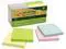 Self-adhesive notepads are made with a high percentage of recycled material. Write on with virtually any pen or pencil. Assorted colors include green, pink, yellow and blue.