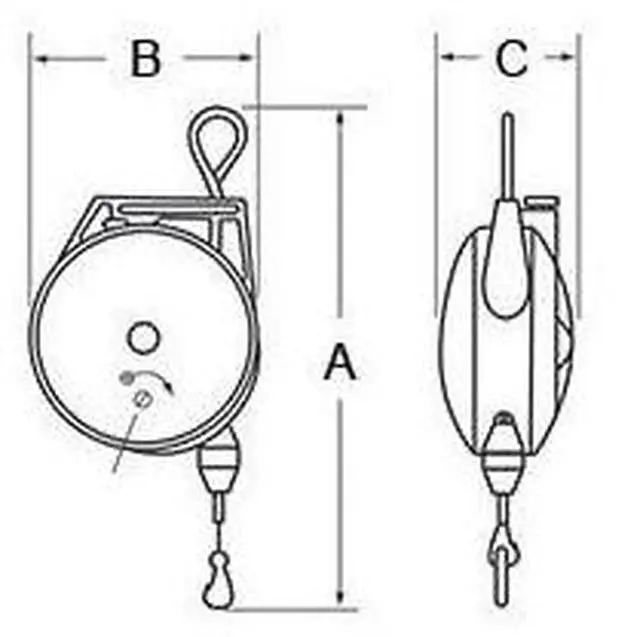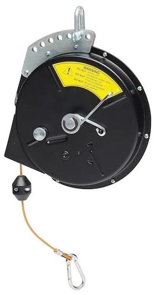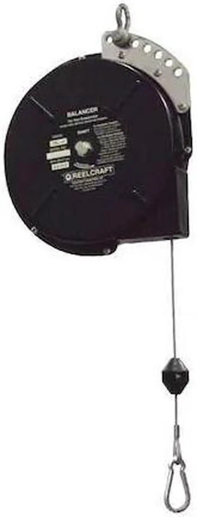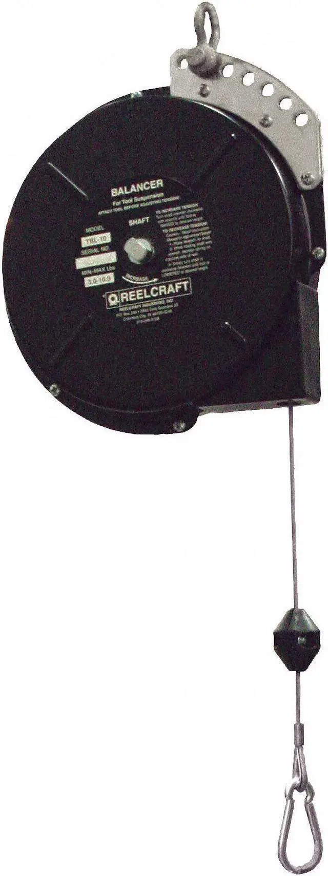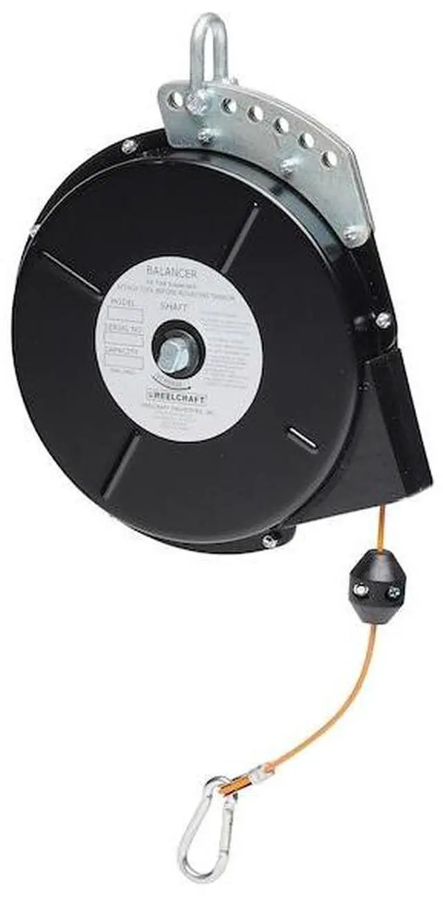 Tool Balancer, Product Type Tool Balancer, For Tool Weighing 5.00 to 10.00 lb, Maximum Tool Weight 10 lb, Minimum Tool Weight 5 lb, Cable Length 8 ft, Cable Material Zinc Plated Steel, Housing Material Steel, Reel Mount Type Suspension Shackle, Reel Height When Retracted 13 7/8 in, Lock Mechanism Ratchet Locking, Rotation Type Fixed, Tool Attachment Type Spring Clip, Shock Absorption Not Included, Spring Fail Mechanism No, Drum Type Standard, Includes Cable Stop, Safety Tool Clip. This item has been restricted from sale in the following state (s): []