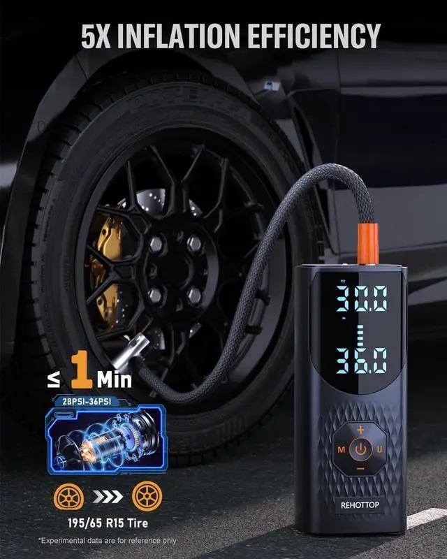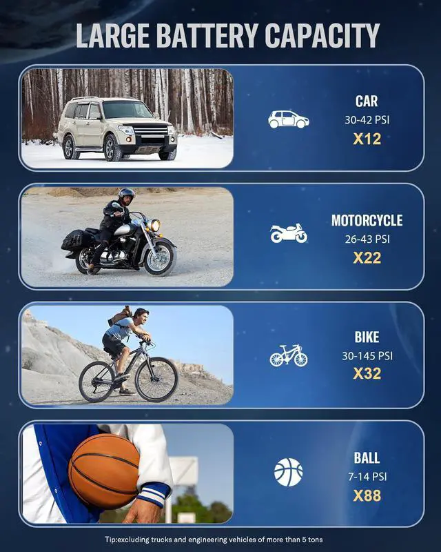 Perfect as an air pump for car tires cordless, its also suitable for bikes and other inflatables, making it a multi-purpose battery powered air pump for car tires. The cordless tire inflator portable air compressor provides the freedom to inflate without tangled cords, while the automatic air pump for car tires mode lets you set your desired pressure and walk away.