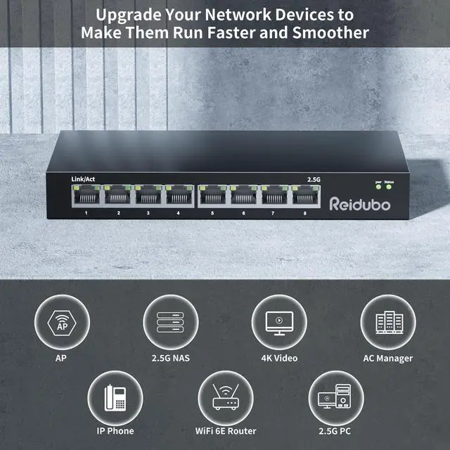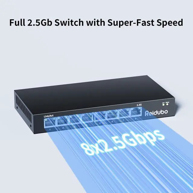 Super-Fast 2.5Gb Speed: Don't let a lagging network slow you down. Upgrade your office and home network with this 2.5G Ethernet switch, delivering 2.5 Gbps across all 8 ports, 2.5X faster than gigabit switches. With up to 60Gbps switching capacity, it maximizes data transfer for all connected devices.
