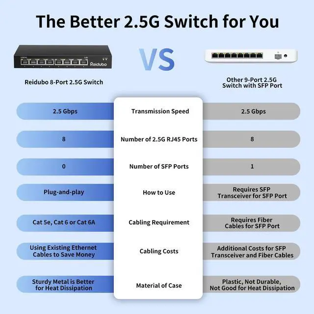More Connections, Saving Cost: Equipped with eight RJ45 ports, this 2.5Gb switch provides extra connections minus the hassle of optical SFP ports. It delivers remarkable value by eliminating the need for extra SFP transceivers and fiber optic cables.