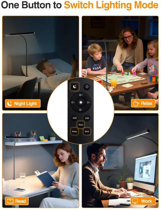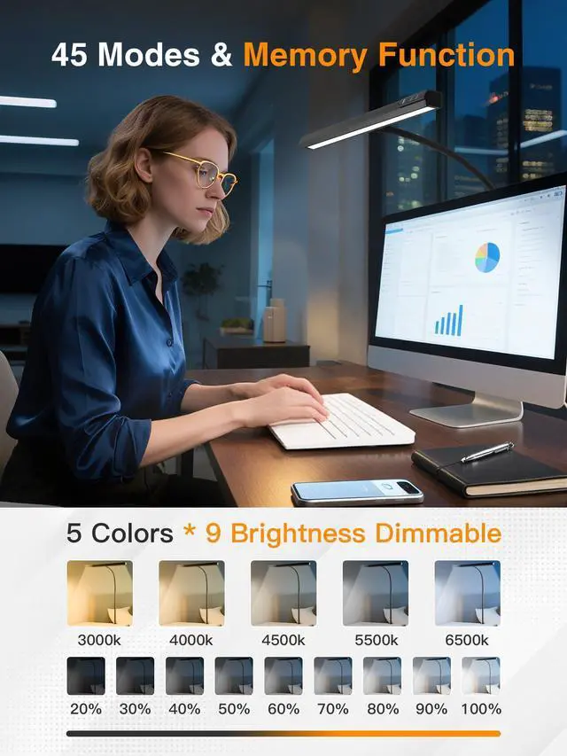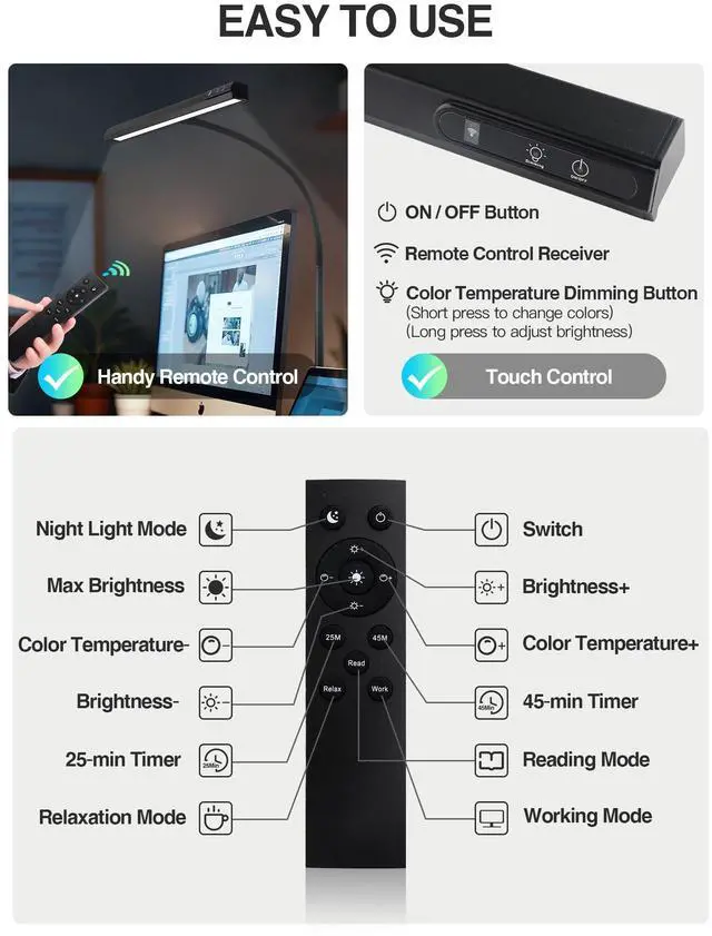 Upgraded 5 Functions Desk Lamps for Home Office: Upgrade 45 Lighting Modes: this LED desk lamp is equipped with 5 Colors+9 Brightness Dimmable+Memory Function; Easy to Use: Touch & Remote Control. You can touch the buttons on the lamp head to choose the lighting mode, or use the handy remote control; The 12W desk lights for home office have upgraded super bright LEDs, brightness up to 1000 lumens; Upgrade the full spectrum eye protection monitor light & computer light: not easy to cause eye fatigue, even if working for a long time; 25min-/45min-Auto Off Timer: Set Auto-off timer to remind your reading/working hours have ended, and take a break to prevent eye fatigue.