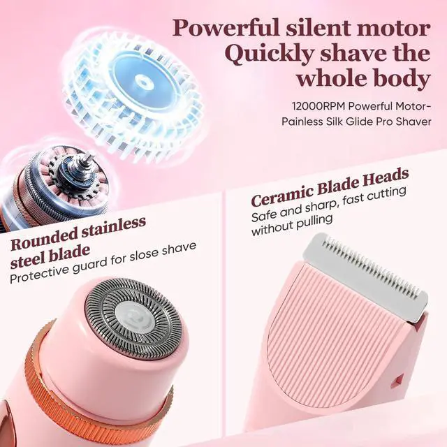 Painless & Safe with Advanced Ceramic Blades Glide smoothly towards silky-skin without nicks, cuts, or irritation! Our hypoallergenic ceramic blades are designed to be kinder to your skin than metal, preventing redness and ingrown hairs. Enjoy a completely pain-free hair removal experience, even on your most delicate and intimate areas. Perfect for beginners and those with sensitive skin.