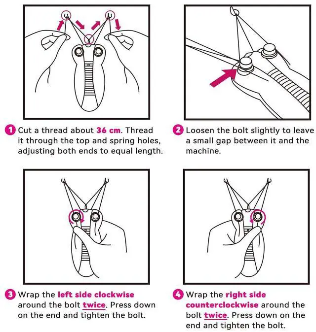 Important Tips:Install the cotton thread a little loose to ensure that there is enough space for the machine to run.(Note: just a little loose, if install too loose, the thread may come out of the spring when working.)