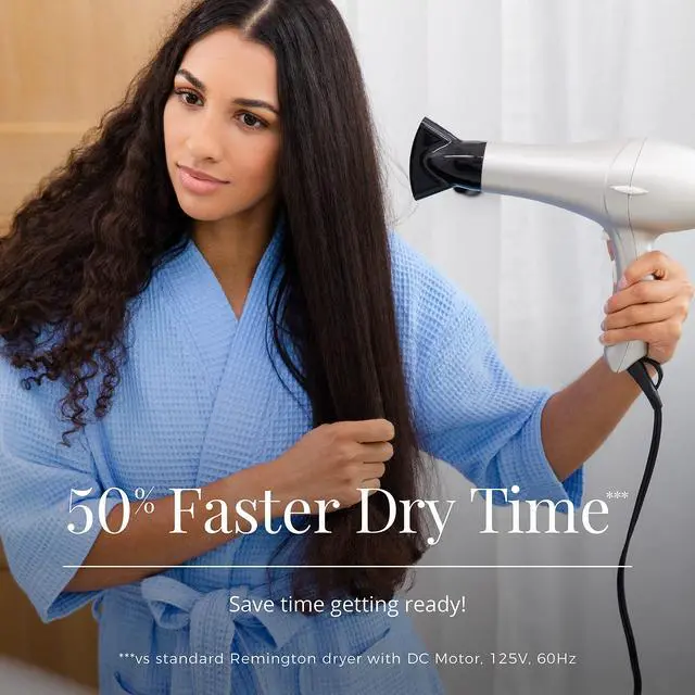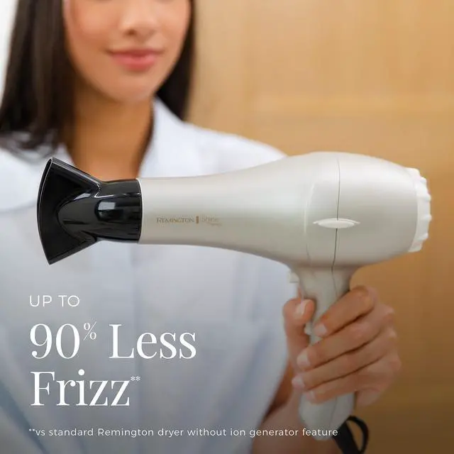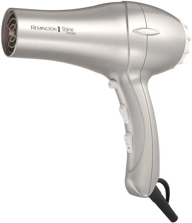 Rejuvenate your hair while you style and create a look that radiates shine and confidence with REMINGTON Shine Therapy. The REMINGTON Shine Therapy Argan Oil & Keratin Hair Dryer delivers brilliant shine with a built-in ion generator and a micro-conditioner, antioxidant-rich Argan oil, and protein-rich Keratin infused grill. As you dry your hair, the micro-conditioner releases onto the hair to reduce frizz for smooth, radiant shine. Get up to 90% less frizz** and 50% faster dry time. *** Use with the full suite of REMINGTON Shine Therapy products to achieve your favorite look.