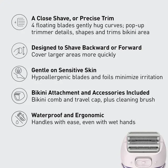 Groom the bikini area safely, without harsh wax or aggressive razor burn or razor bumps. The built-in pop-up trimmer has rounded tips that let you shave the bikini and other small areas without irritation; pop on the included bikini comb to get the trim length you want.