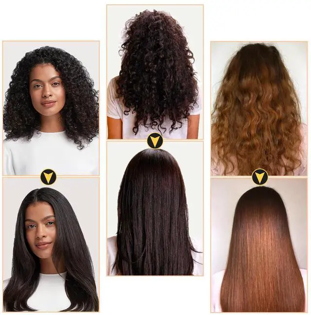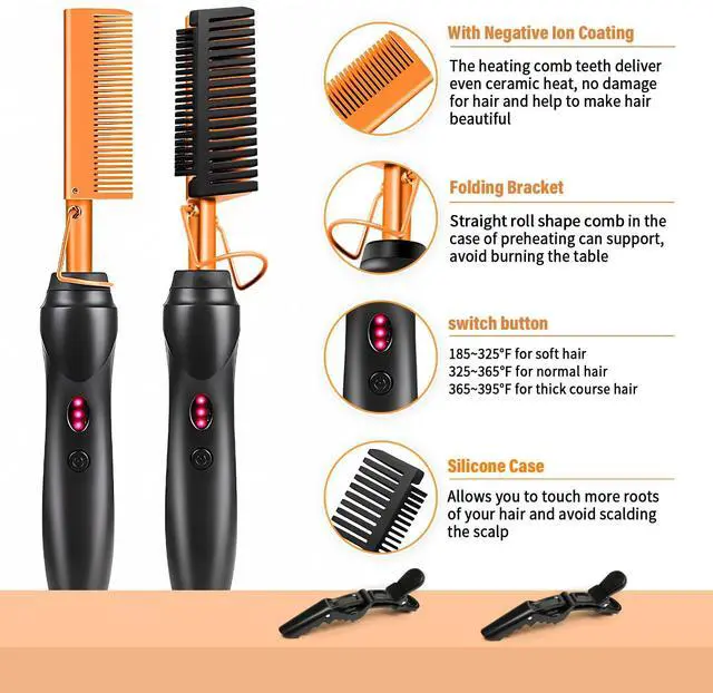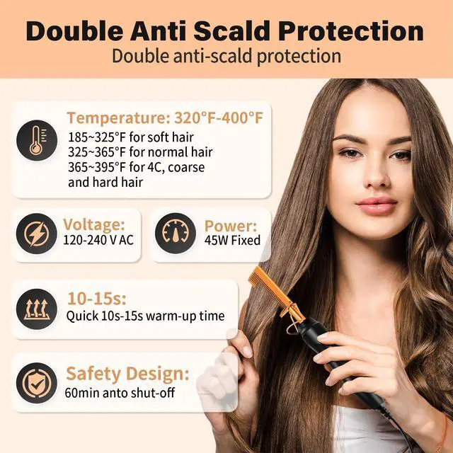 hot air comb: Suitable for different hair types: suitable for short or long hair,straight or curly wigs.soft hair: temperature 185~325°FNormal hair: temperature 325~365°Frough and hard hair: temperature 365~400°F