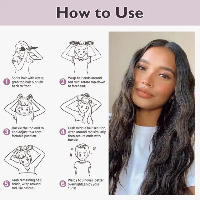 Wrap sections of hair around the rollers, secure with the metal hook, and leave in overnight. Remove in the morning for natural, heatless curls., Rubber, Rod, curly