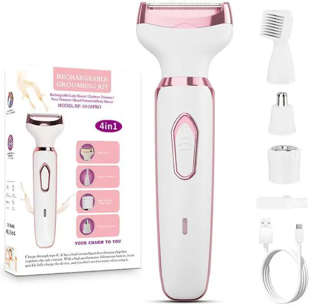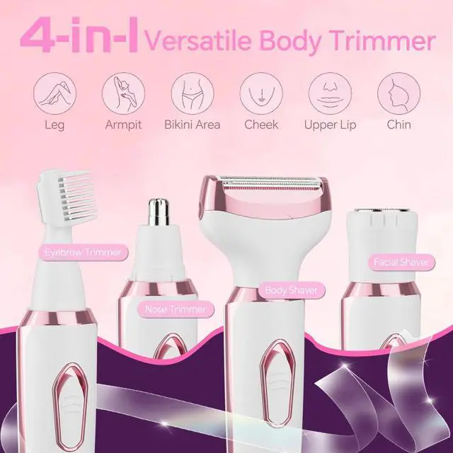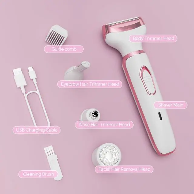 Versatile Shaving Heads: The Women's Electric Shaver is equipped with four heads for shaving, eyebrow shaping, nose shaving, and hair trimming. It effectively removes unwanted hair from the face, arms, legs, body, bikini line, and underarms, ensuring you look confident and beautiful.