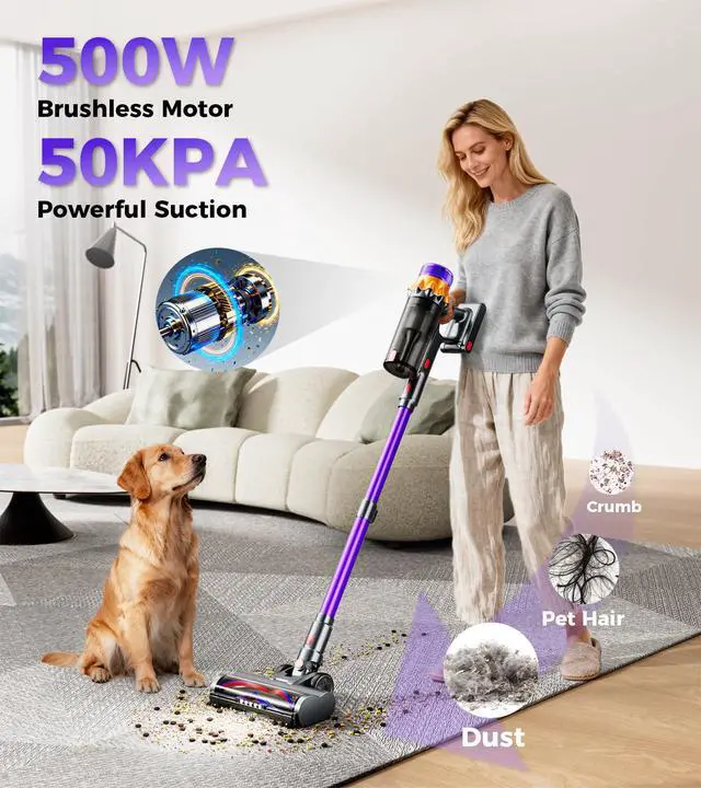 500W Brushless Motor & 50KPa Strong SuctionThis cordless vacuum cleaner is equipped with an upgraded 500W brushless motor, delivering up to 50,000Pa of suction for deep and efficient cleaning. It effortlessly tackles dust and debris on hard floors, pet hair on carpets, and dirt in corners, walls, and high places