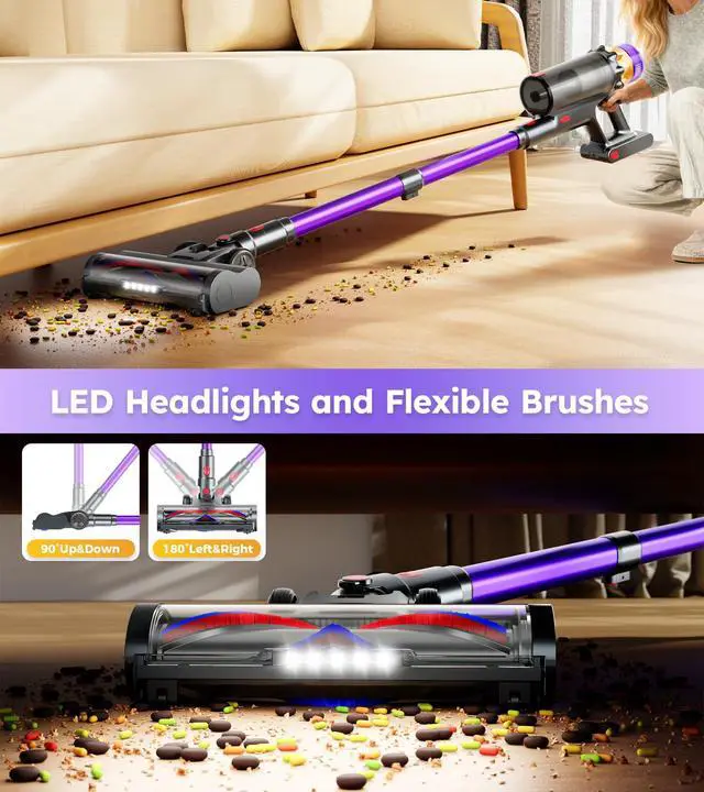 Anti-Tangle V-Shaped Brush with LED LightThe V-shaped roller brush effectively prevents hair tangling while combining soft and stiff bristles to protect floors and deeply clean carpets. The flexible swivel head rotates 0°180° sideways and 0°90° vertically for easy access under furniture and into corners. LED lights illuminate hidden dust and debris for a spotless clean