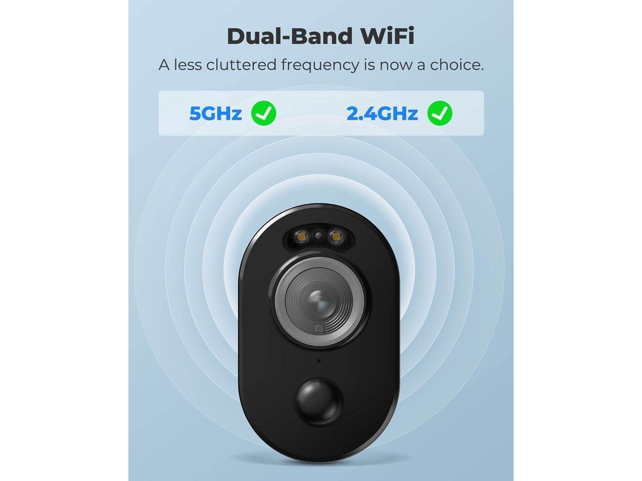 - 2.4Ghz/5GHz Dual Band: By freely switching between 2.4GHz and 5GHz frequency bands, this battery camera provides higher performance for camera networking.
