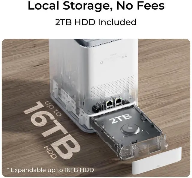 Record every second locally on the Wi-Fi 6 Wireless Security Center. With a built-in 2TB HDD, it offers ample storage without recurring costs. Need more space? Easily expand your storage with an HDD up to 16TB. Rest easy knowing your home is under watchful eyes 24/7.