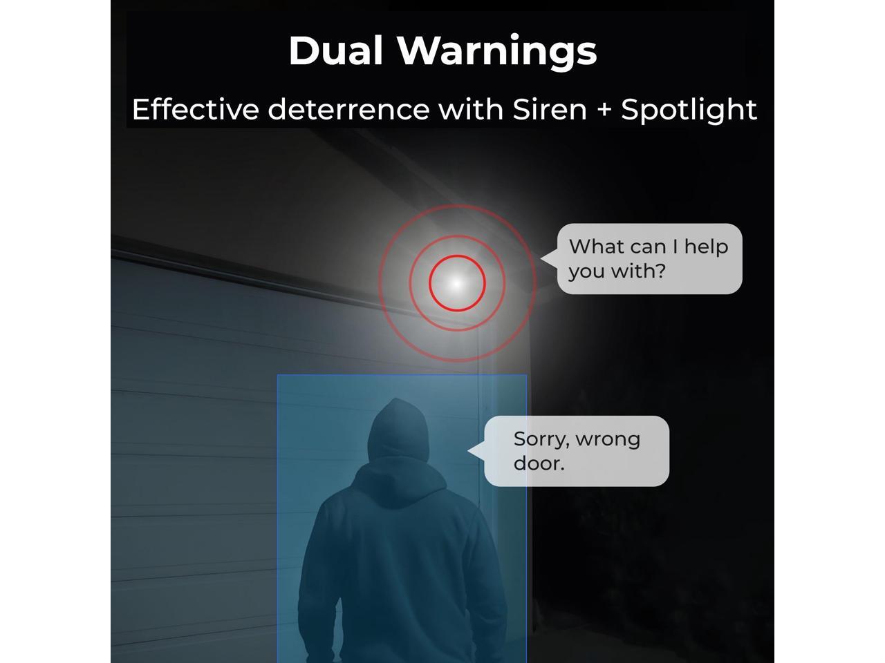 - INSTANT ALERTS: When something suspicious is detected, spotlights and siren on the camera serve as strong deterrents against intruders.