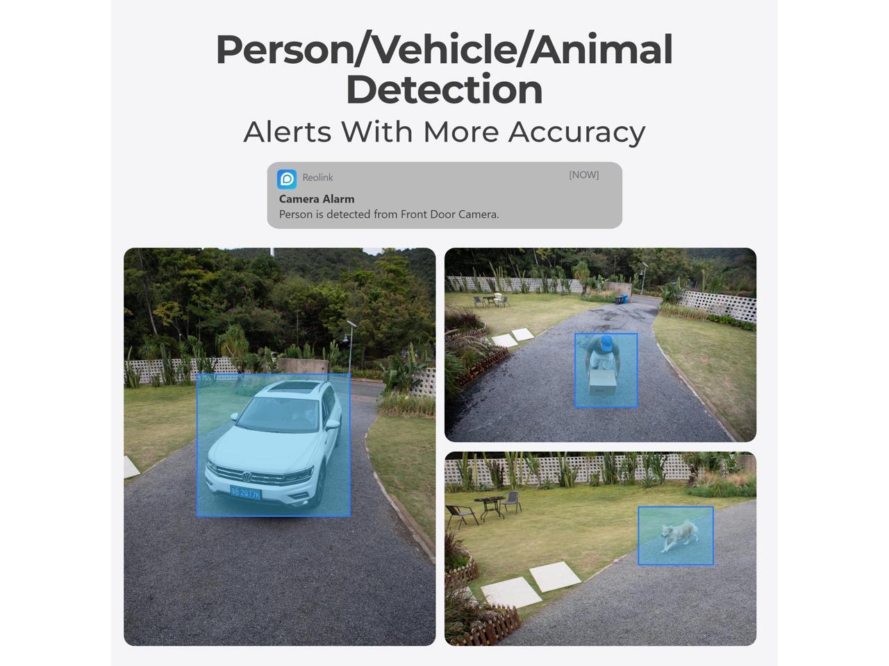 - TWO-WAY AUDIO & SMART DETECTION: Smartly distinguish person/vehicle/pet shapes from other objects, and send instant, accurate alerts to you. You can talk to the person by the camera side from anywhere.