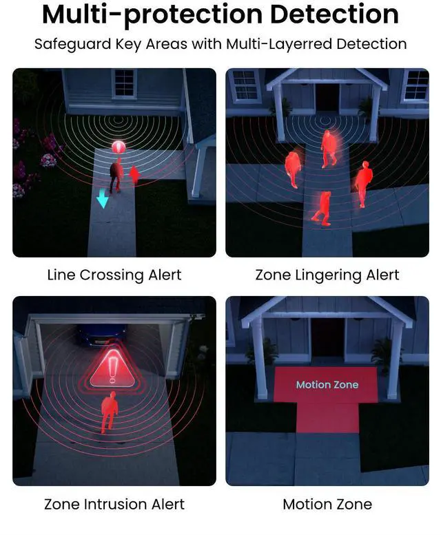 Upgraded with advanced AI-driven detection technologies, this camera system detects not only people, vehicles, animals, but more specific events like line crossing, zone intrusion, or zone loitering. With more precise alerts, stay steps ahead of potential threats.