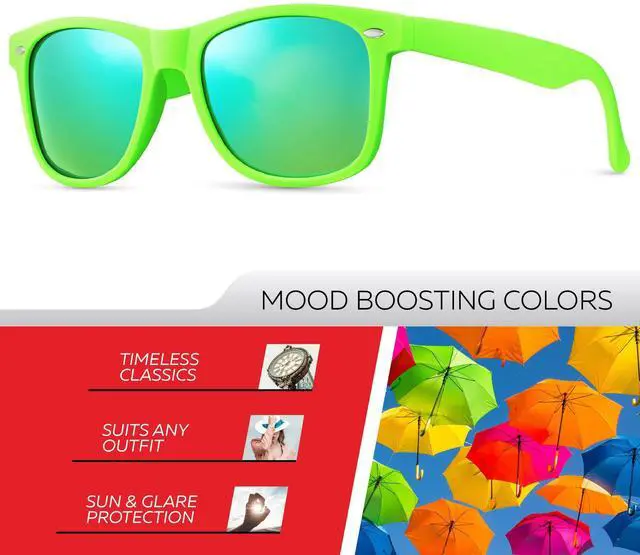 • DESIGNED TO PLEASE ANY TASTE, ANY SHAPE AND MATCH ANY OUTFIT: The Retro Rewind Sunglasses are a mixture of vintage style, contemporary fashion, and modern technology. The sunglasses will put an exclamation point on your casual, business casual or athletic outfit and help you look sharp, crisp, and sophisticated! Available in 50+ color combinations.