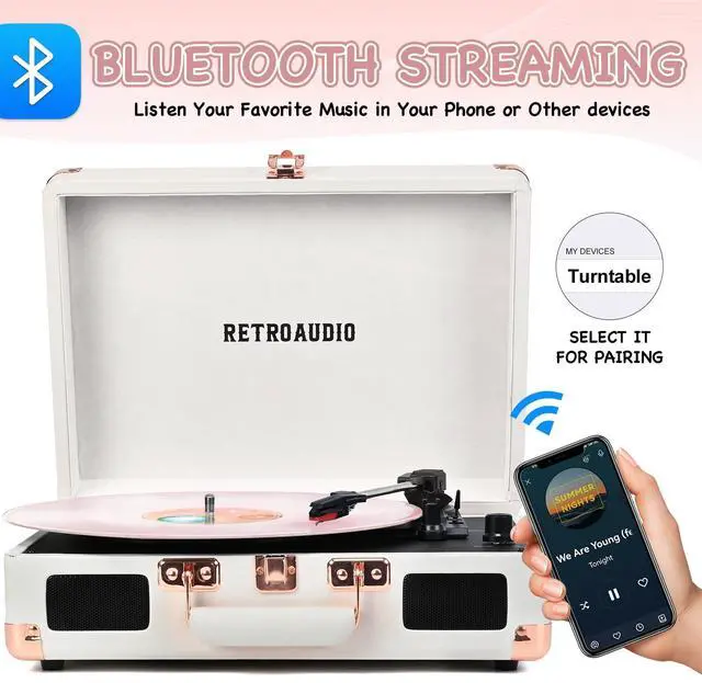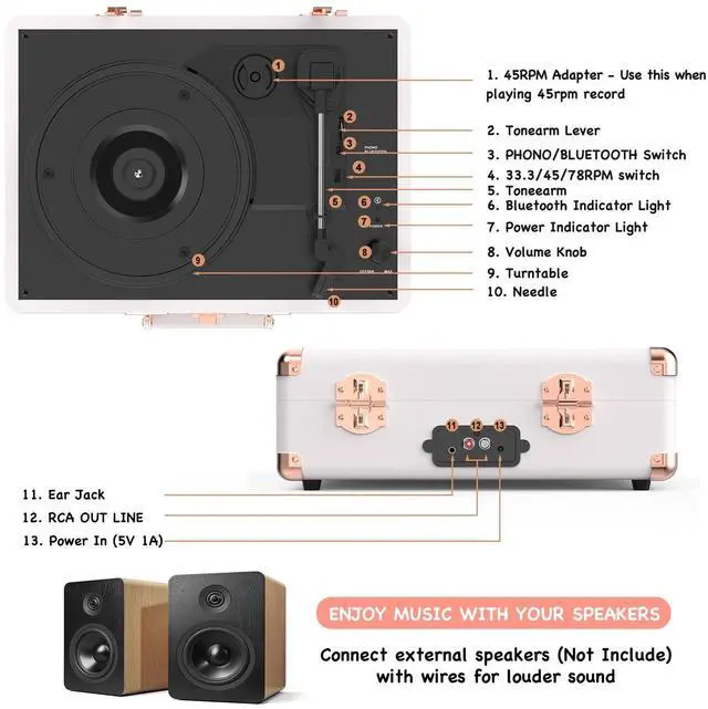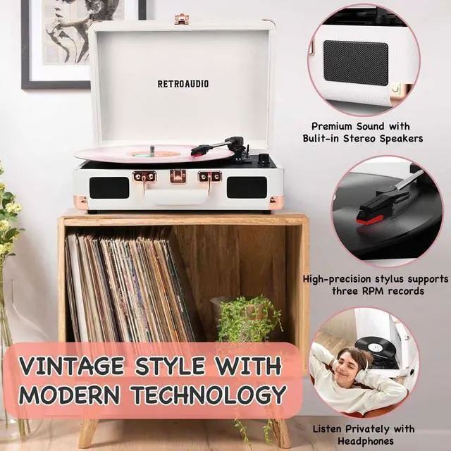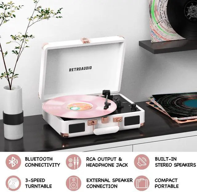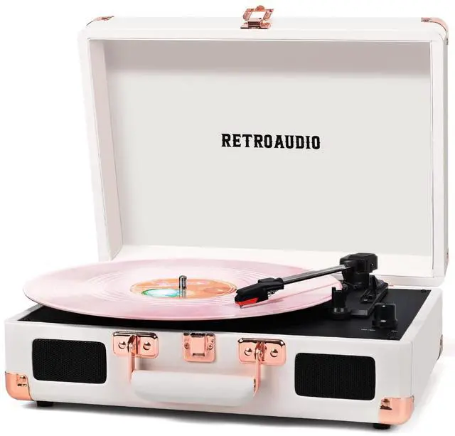 • Lovely Suitcase Record PlayerThe record player's vintage wood design with rose gold hardware. Turntable in a vintage suitcase with a convenient carrying handle, allowing you to listen to your music anytime, anywhere. Perfect for dorms, bedrooms and offices.