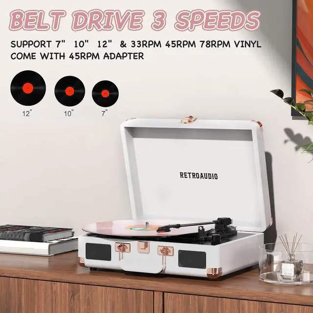 • 3-Speed and 3 Sizes TurntableSupport 33 1/3, 45, 78RPM and 7", 10", 12" Vinyl. Equipped with a reinforced turntable and sound-isolating feet, it can effectively prevent the vibration caused by playback and restore the most authentic music for you.