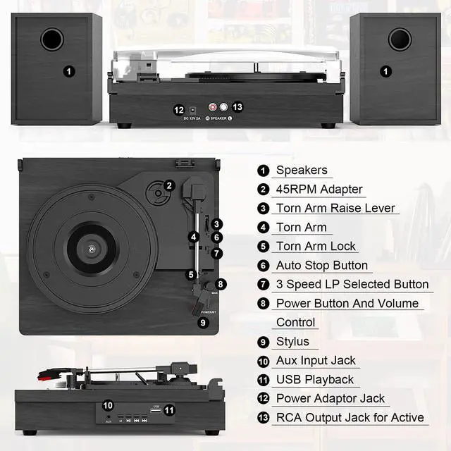 33, 45, 78 RPM Speeds - Support 3 speeds record player with speakers(45-RPM adapter included). Play your favorite vinyl record including 7, 10, 12