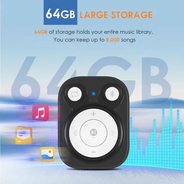 64GB Large Storage & HIFI Sound The mp3 music player with bluetooth is equipped with a 64GB large-capacity storage, allowing you to download at least 1000+ of your favorite songs. With a powerful HIFI chip, you can enjoy the most original sound.