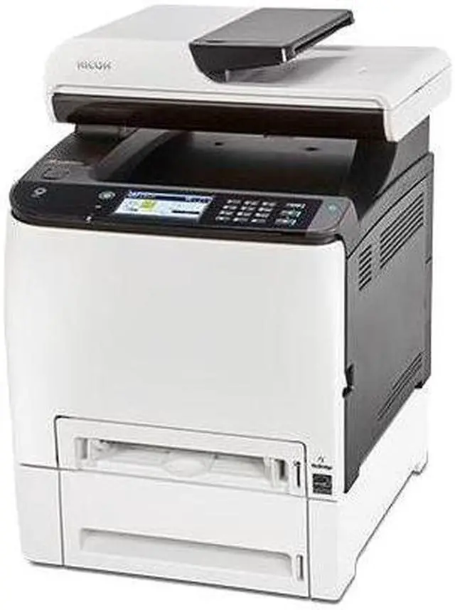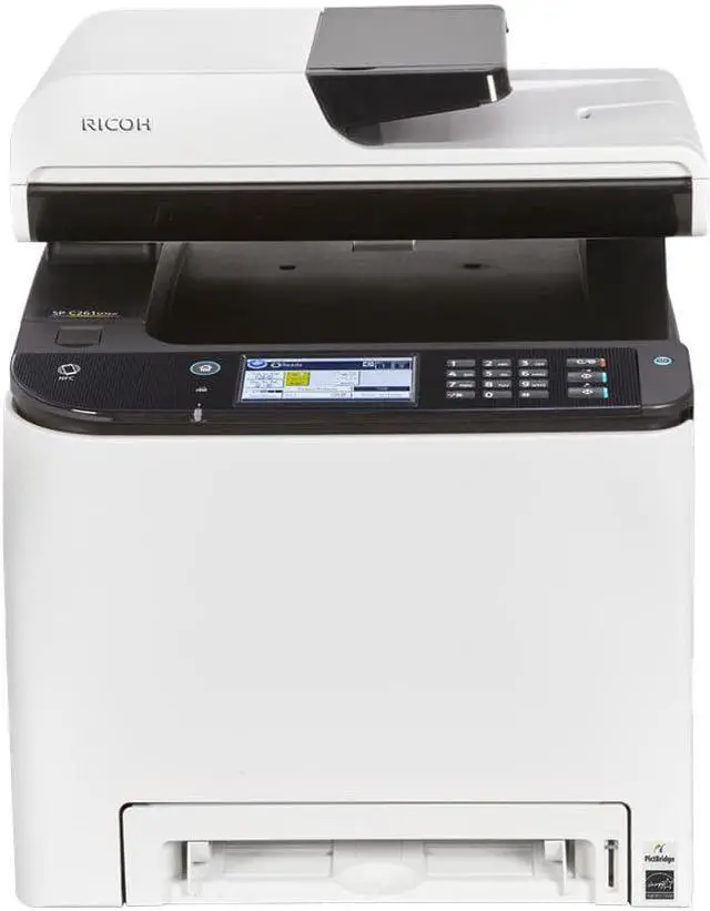 For standard paper handling the SP C261SFNw is equipped with a 250-sheet input tray and a one-sheet bypass. Also, the printer can print from a mobile device by using Apple AirPrint, Google Cloud Print, Mopria or the Ricoh mobile app. For easy operation, the front panel features a large 4.3" color touchscreen LCD and users will have access to a front-facing USB port for scanning to or printing from a portable storage device. Additionally, along with Wi-Fi, this printer offers wired USB 2.0 and Ethernet connections.